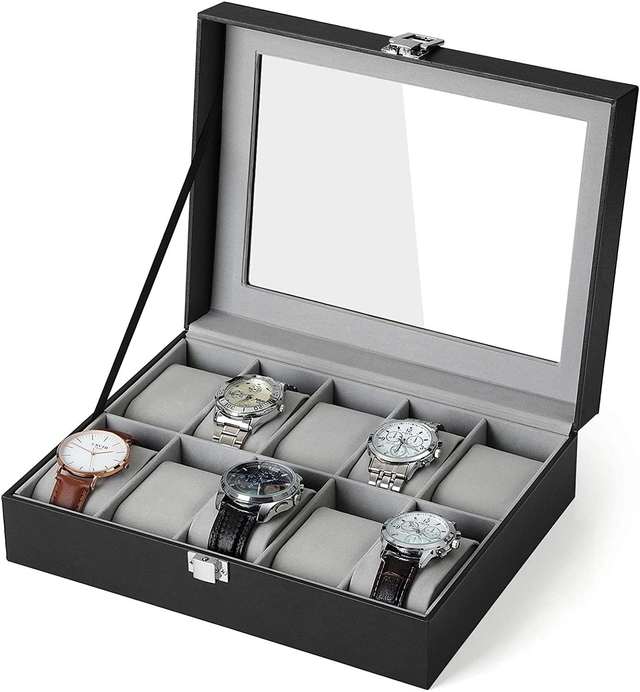 Förvaringsbox med plats för 10 stycken klockarmband klätt i PU-läder utanpå och foder i sammet. Stor glasruta för insyn av alla dina klockor men med en personlig touch.